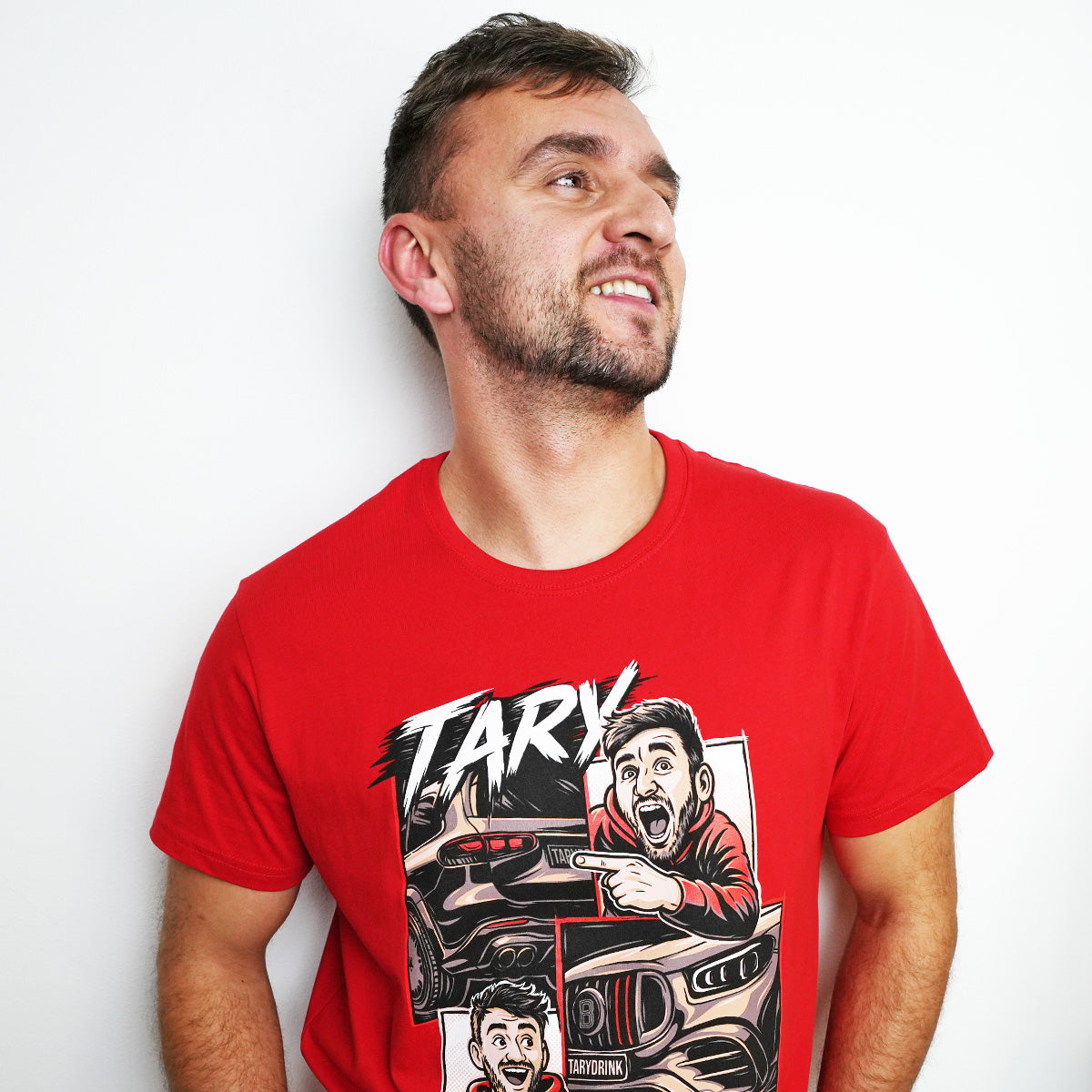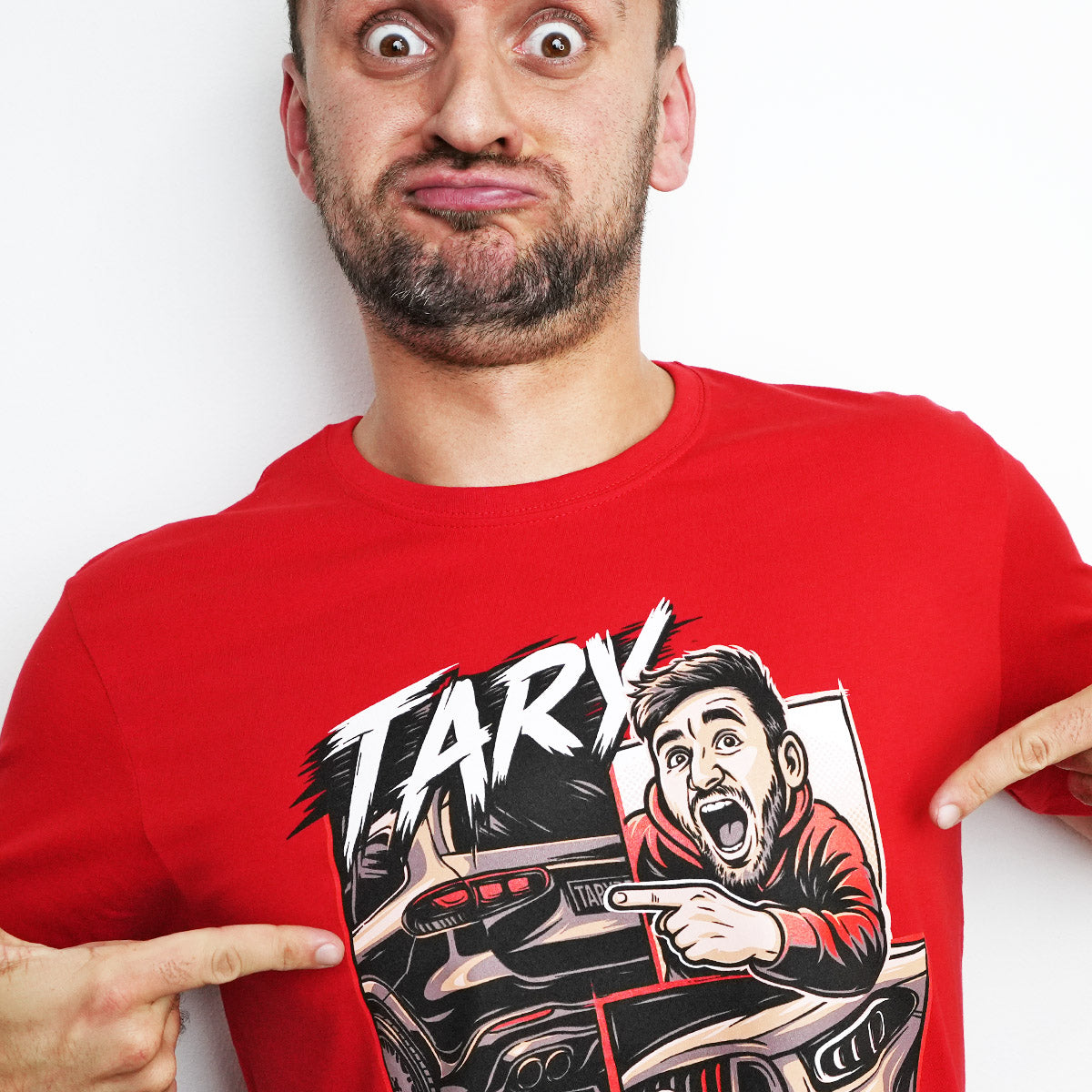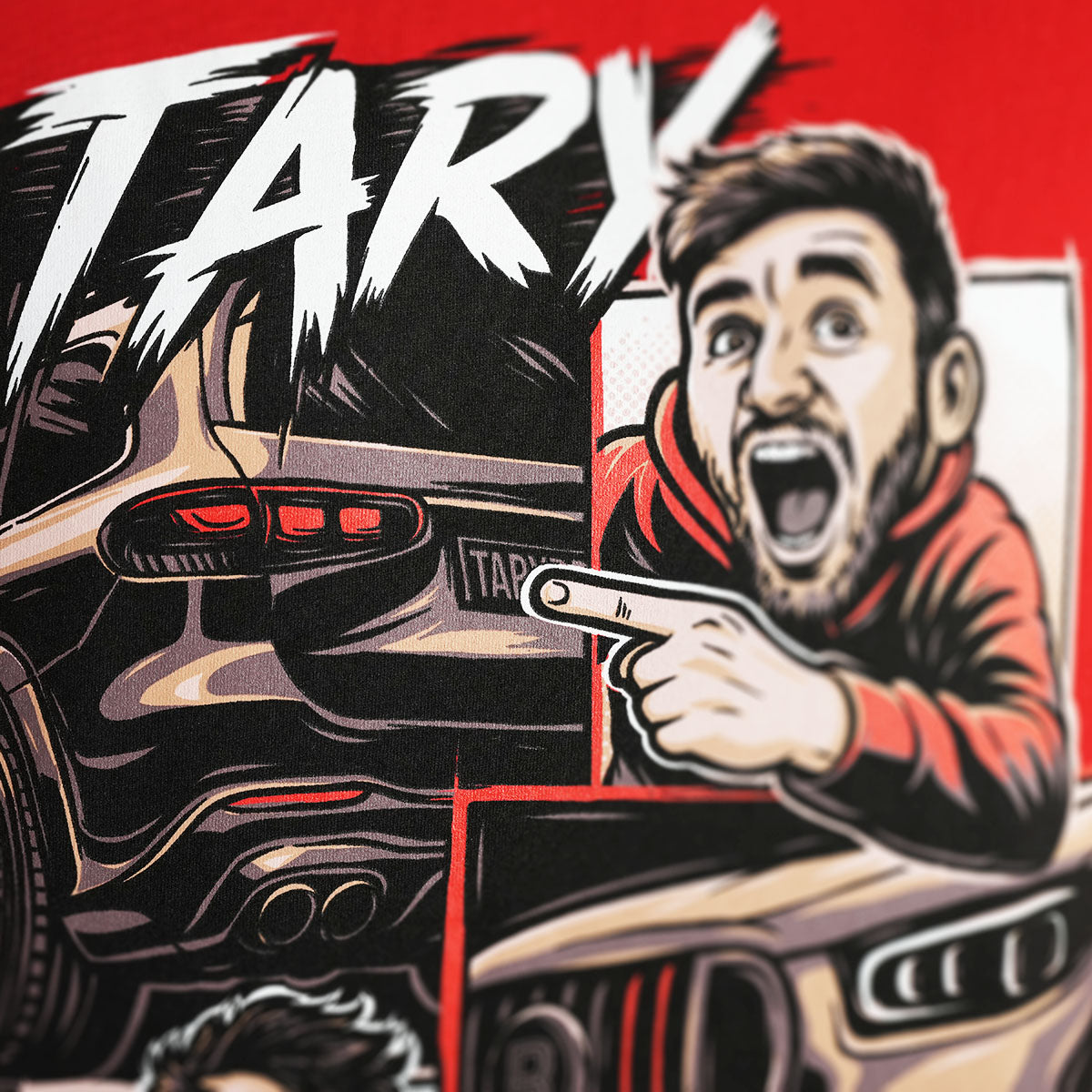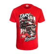 Červené tričko s výraznou komiksovou grafikou inspirovanou spoluprací Tary x Brabus. Jedná se o Taryho oficiální merch.