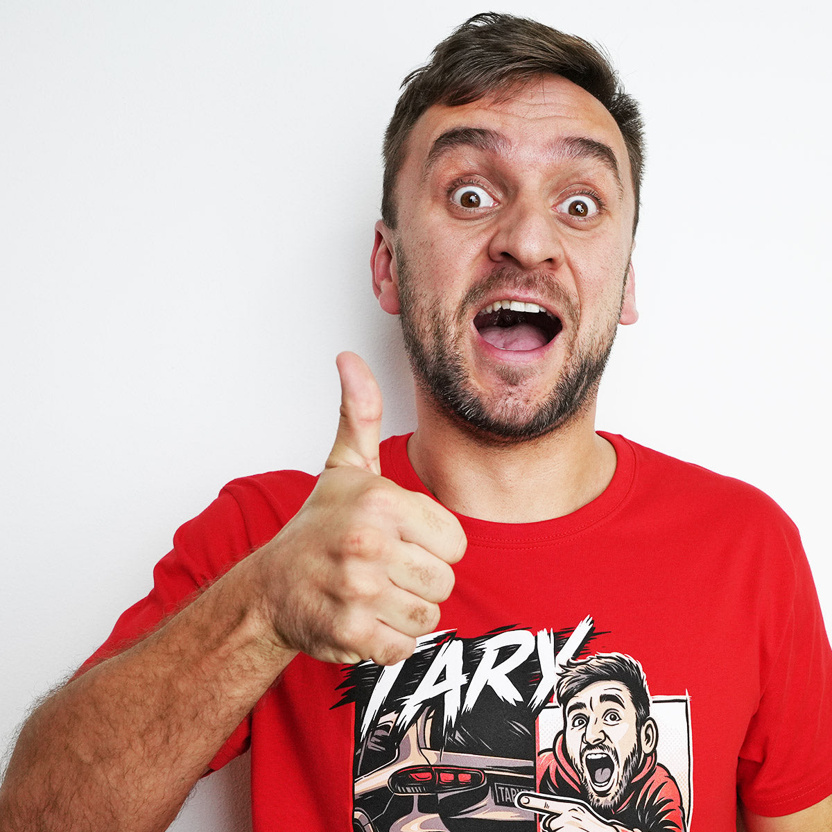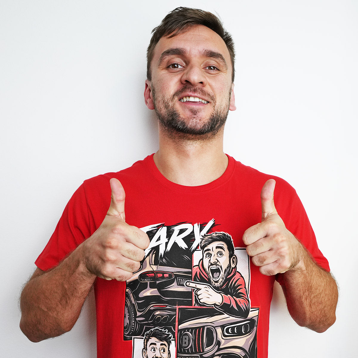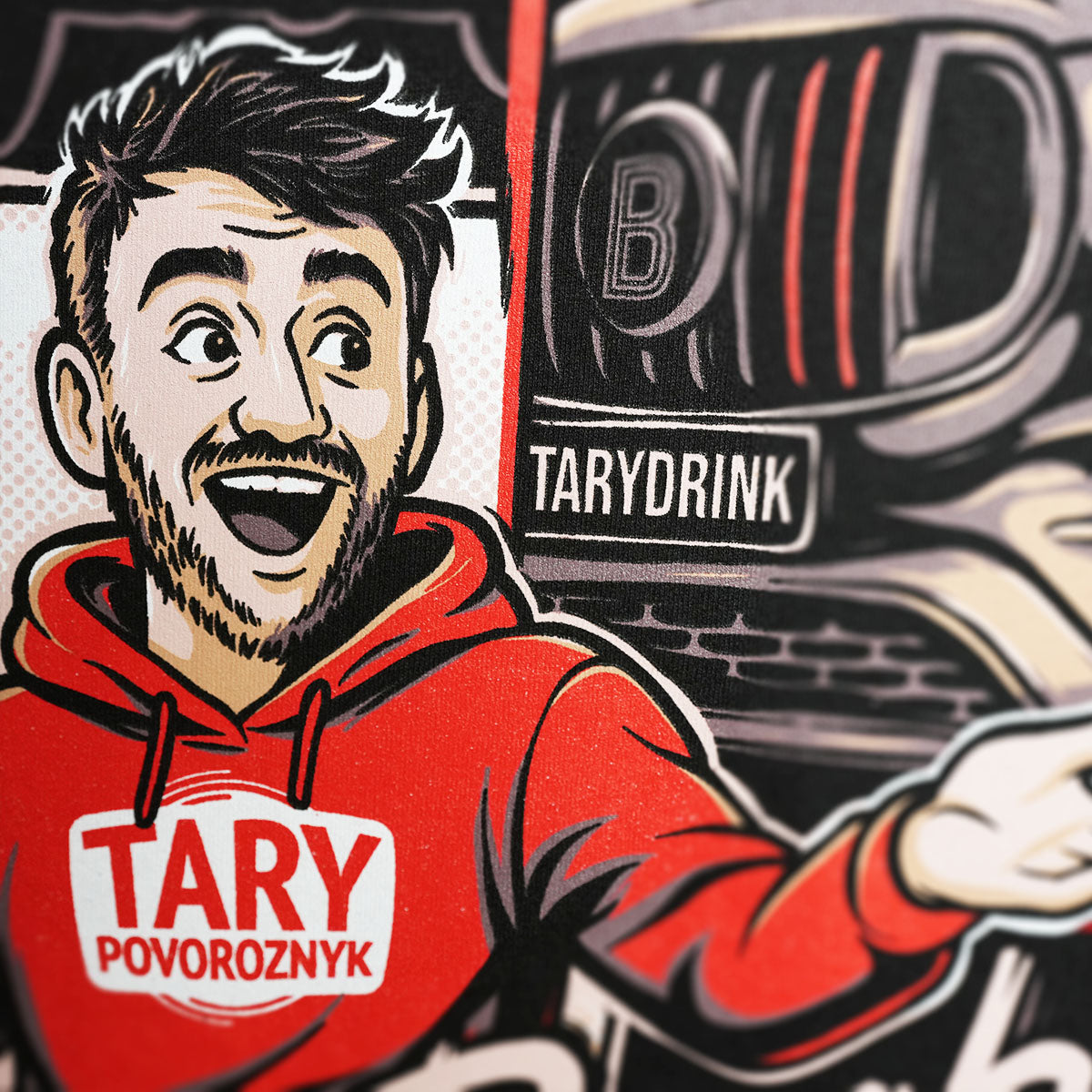 Červené tričko s výraznou komiksovou grafikou inspirovanou spoluprací Tary x Brabus. Jedná se o Taryho oficiální merch.