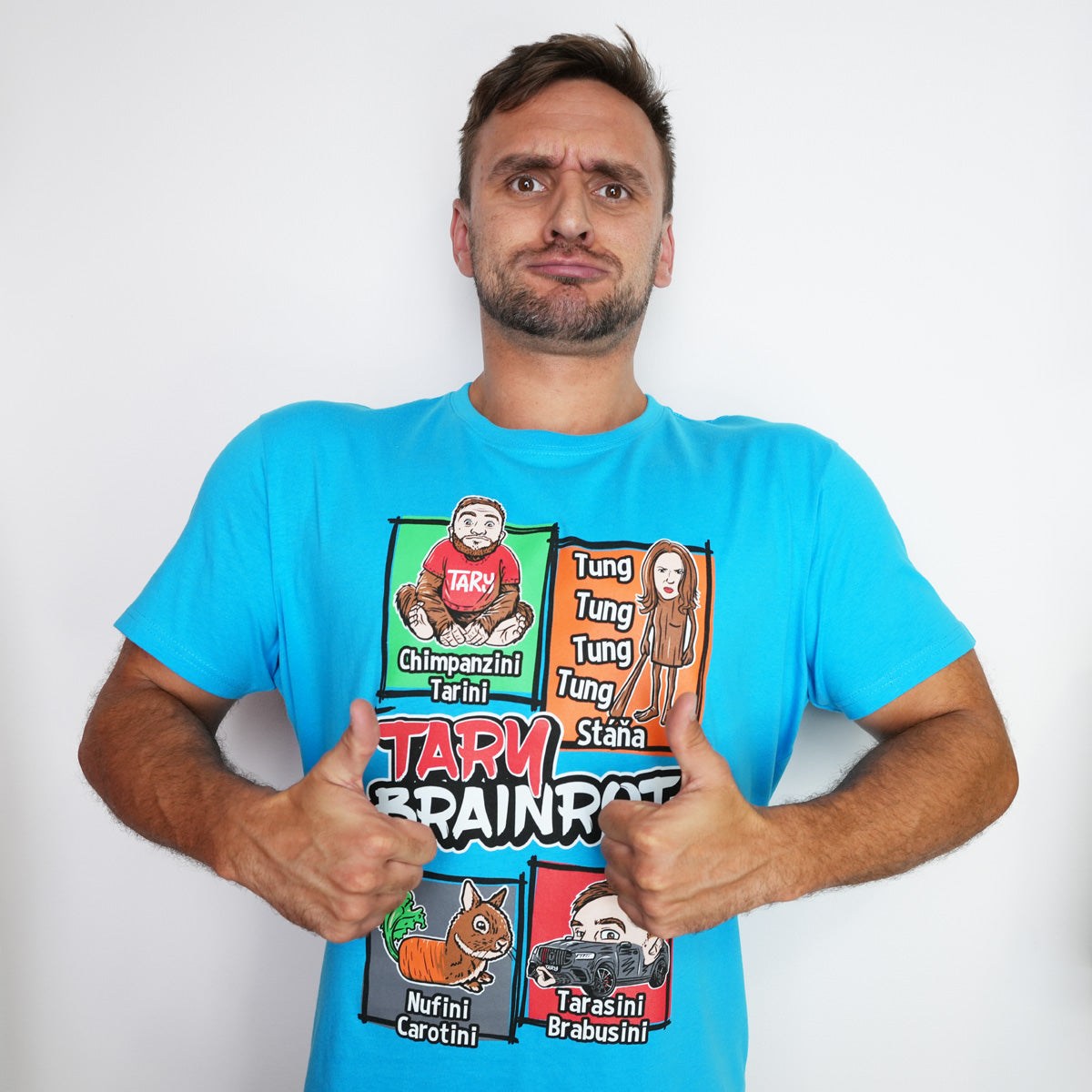 Přečíst víceTyrkysové tričko s motivem TARY BRAINROT přináší energii, barvy a postavičky z Tary světa v jednom výrazném kousku, který nepřehlédneš.