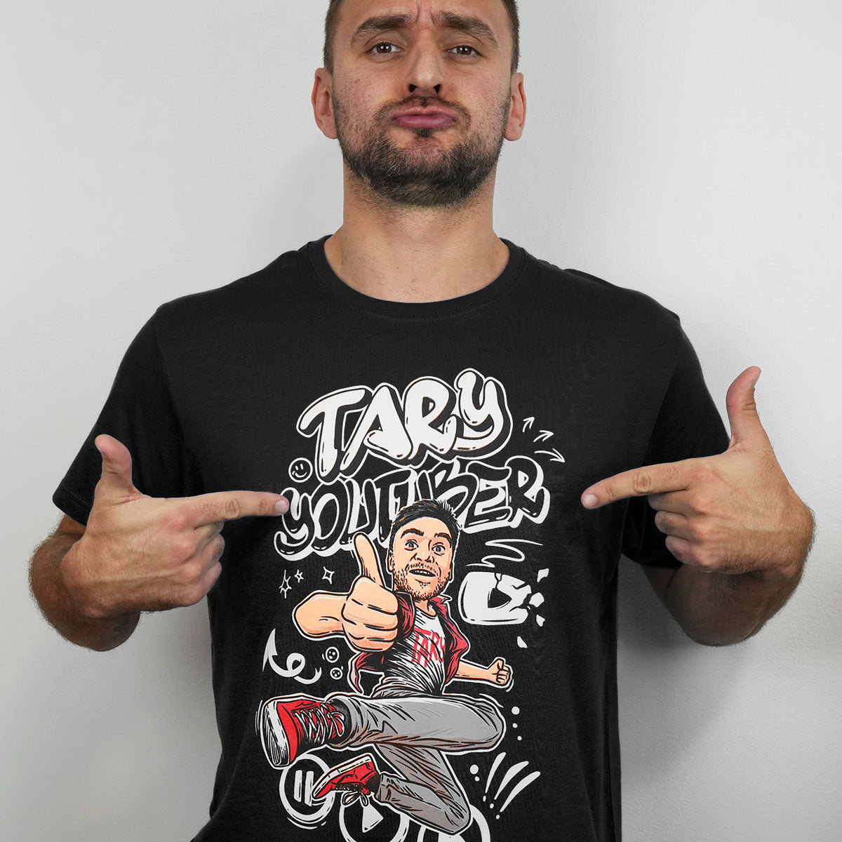 Tady to všechno začíná! Tohle originální tričko s motivem TARY YOUTUBER jsi určitě zahlédl v Taryho videích – a teď ho můžeš nosit i ty. Na hrudi tě čeká velký a detailní potisk Taryho v akční póze, doplněný výrazným nápisem, který přesně vystihuje jeho energii, pohyb a osobnost.