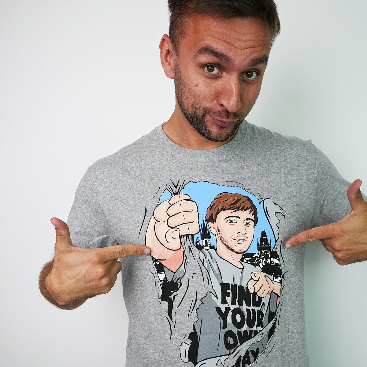 Na přední straně najdeš barevný kreslený motiv Taryho s motivačním nápisem "Find Your Own Way", který se stal symbolem celé komunity. Zadní strana trička připomíná začátky Taryho tvorby – detailní ilustrace parkourových pohybů a nápis "Tary Tutoriály", které formovaly celou generaci mladých parkouristů.