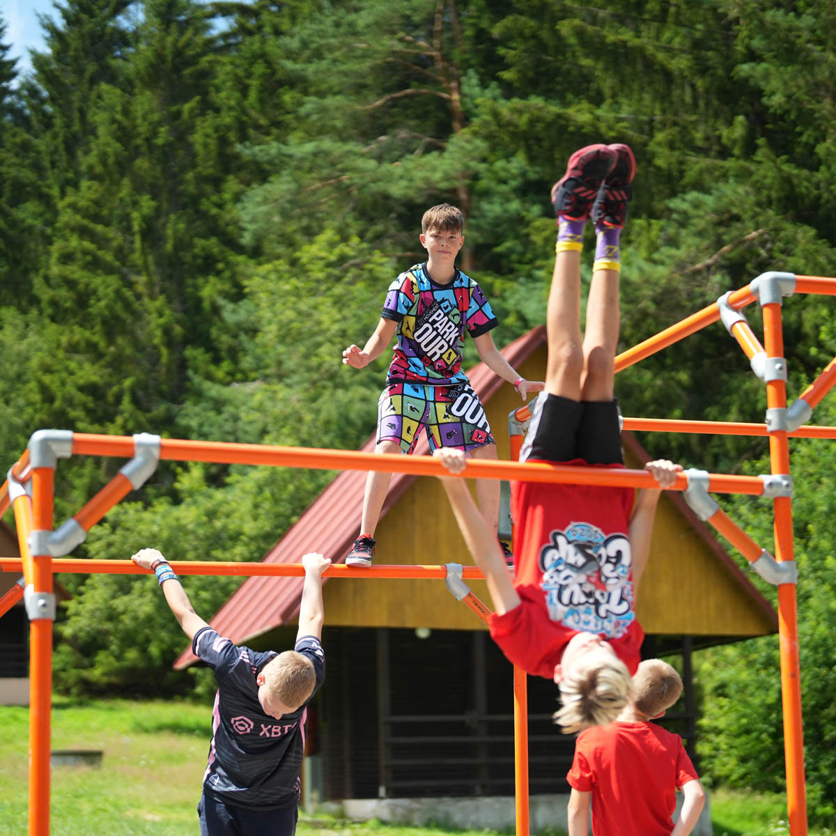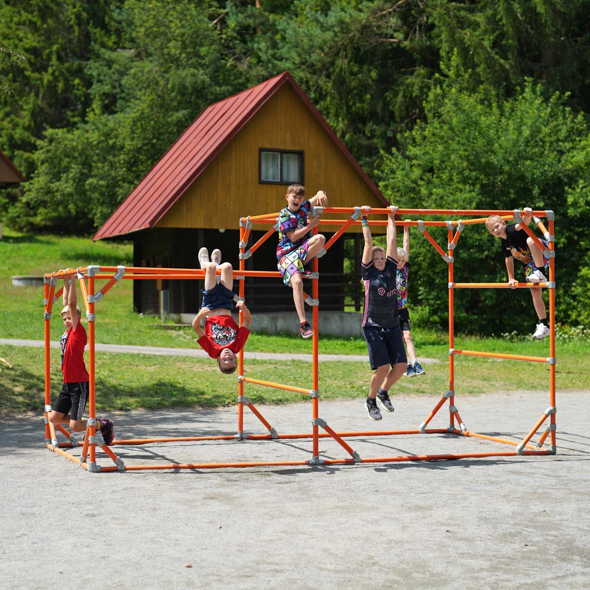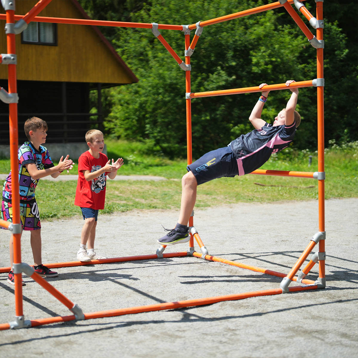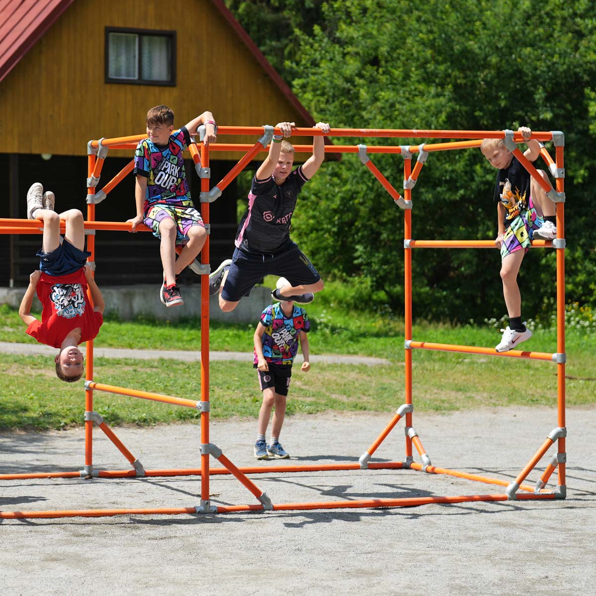 Sestava z trubek a spojek pro trénink parkouru z Tary Campu. Toto lešení bylo používáno pro trénování dětí na Taryho letních Tary Campech.